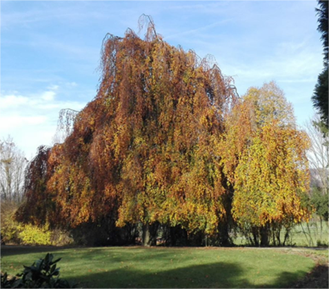 Die Trauerbuche ist ein breit auswachsender Baum mit aufragend wachsenden Ästen.