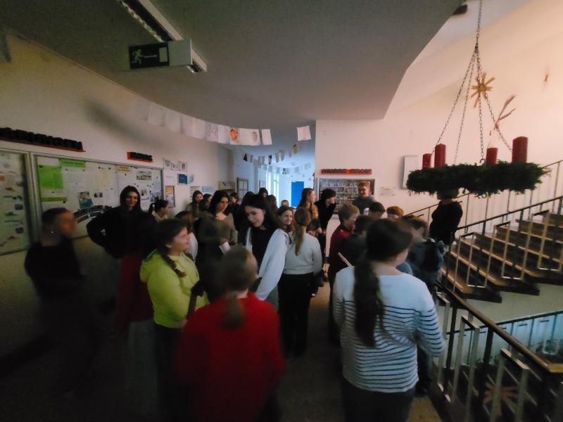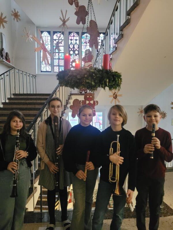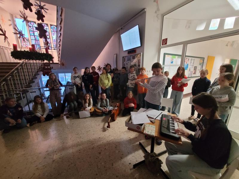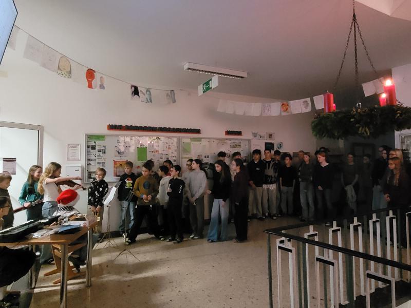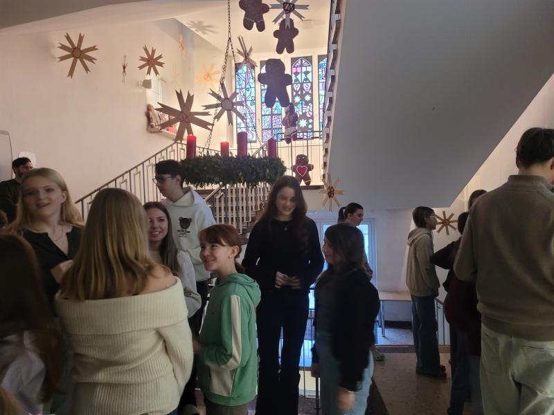 Zwischen der Adventkranzsegnung am 1. Dezember und den vorweihnachtlichen Gottesdiensten am 23. Dezember fanden außerdem stimmungsvolle Adventfeiern in den Klassen und beim großen Adventkranz im Stiegenhaus statt. Begegnungen mit Patenklassen, liebevoll gestaltete Grüße und Musik mit verschiedensten Instrumenten machten die Vorfreude auf Weihnachten spürbar.