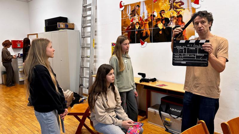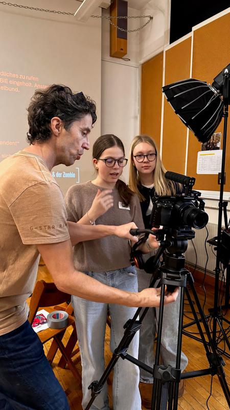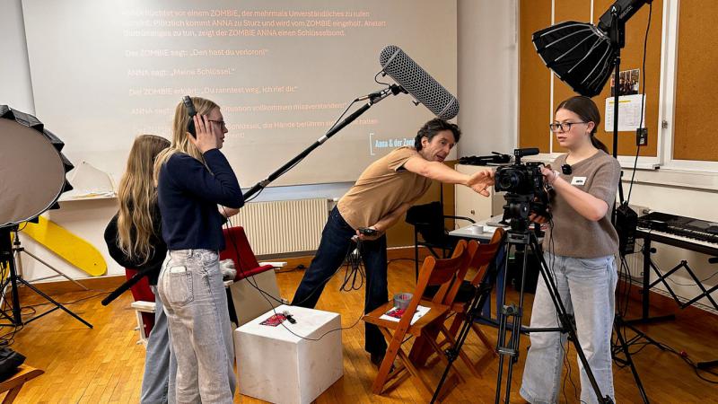 Unter der Leitung von Robert Hinterleitner lernten die Teilnehmer:innen alle Schritte der Filmproduktion kennen – von Kamera und Ton über Rollen am Set bis hin zu Schnitt und Farbkorrektur mit Adobe Premiere Pro.